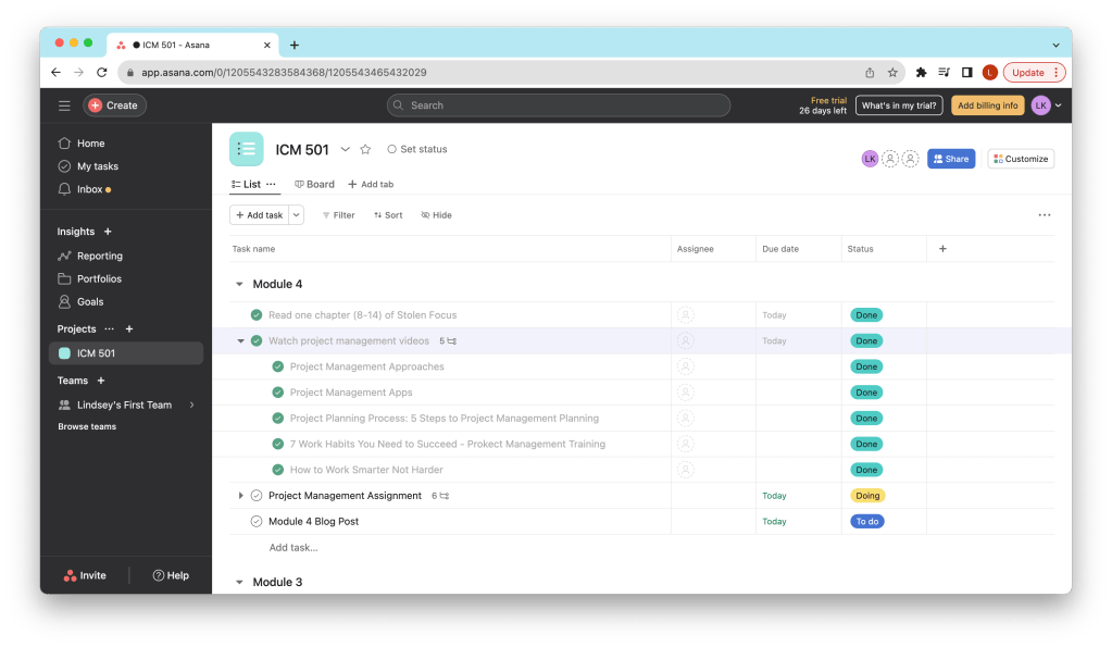 When I first made my Asana account, it took me a little while to understand the platform and how to best use it to optimize my workflow. Since I was making the project management system for the entire ICM501 course, I liked that I could split my to-do list into different sections, or in this case, modules (seen below).