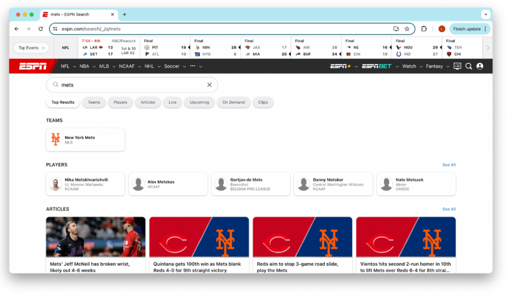 The ESPN search page makes me feel content and satisfied because my need for choice and ease of use are being met. Once I put in a search, the results page is very aesthetically pleasing and I love that it gives me options for the types of content I want to consume. I also love that the results are sorted into different categories for ease of use, such as teams, players, articles, streams, videos, etc.