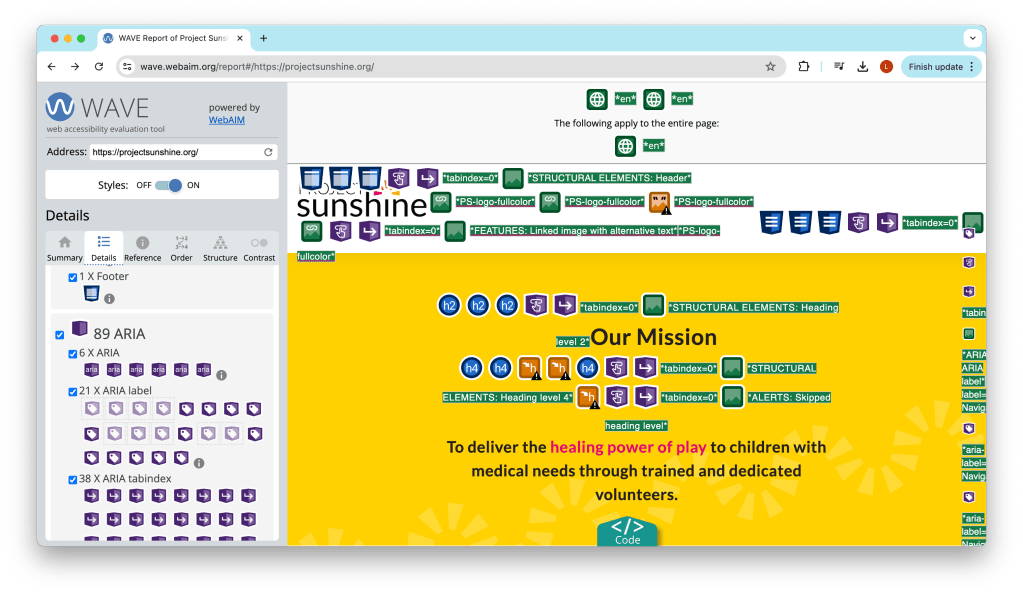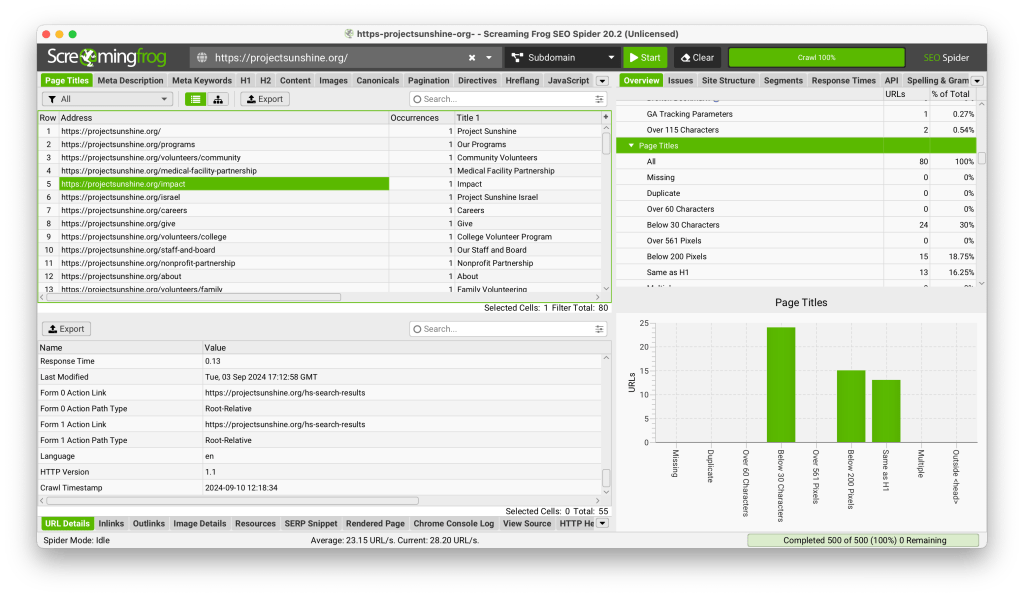 After running the Project Sunshine website through Screaming Frog SEO Spider and WAVE, here are some of the insights I’ve collected: